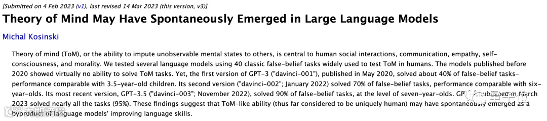 就在前几天他曾发表一篇相关论文:心智理论可能自发地出现在大型语言模型中。
