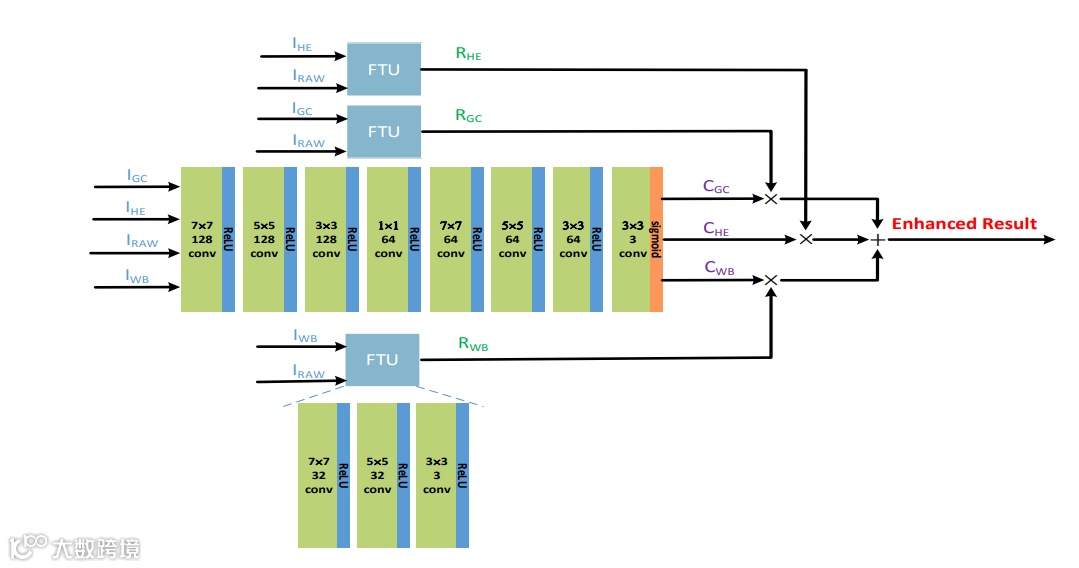 DUIENet: 基于所构建的UIEBD数据集,作者提出了一种用于水下图像增强的CNN模型,称为DuwieNet。DuwieNet是—种门控融合网络,它将输入与预测的置信度图融合以获得增强的结果。首先通过FTUs将输入转换为精确的输入,然后预测置信度图。最后,将改进后的输入与相应的置信度图进行融合,得到增强后的结果。其结构图如下所示: