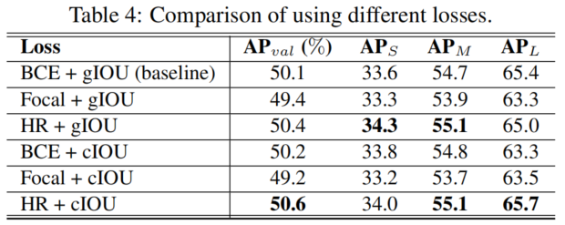 这表明在小目标的精度和总精度之间有较好的平衡。在第三阶段,关闭数据扩充,将L1损失设为调节损失,用cIOU损失代替gIOU损失。