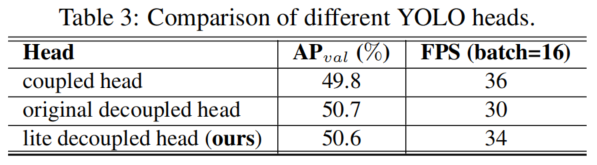 尽管如此,一个被解耦的头却会带来额外的推理成本。作为改进,本文作者设计了一个较轻的解耦头,并共同考虑了模型的推理速度和精度。