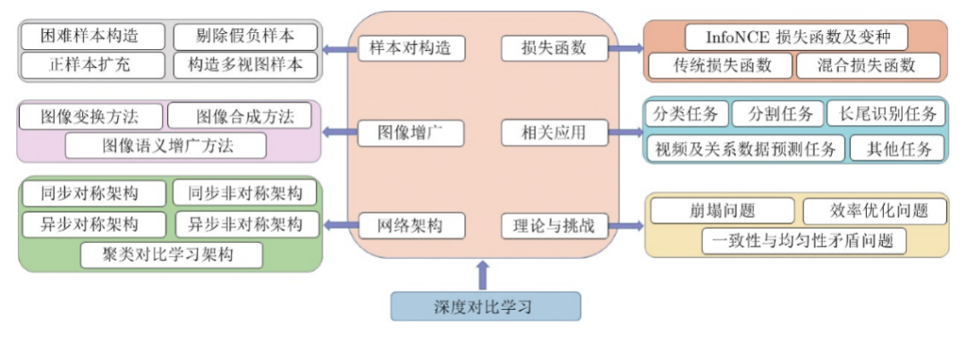 对比学习是近年的研究热点. 本文系统梳理了对比学习的研究现状, 提出一种将现有方法划分为样本对构造层、图像增广层、网络架构层、损失函数层和应用层的归类方法, 并从自监督对比学习算法入手, 分析和归纳近四年主要的对比学习方法. 而且, 本文还全面对比了不同方法在各种下游任务中的性能表现, 指出了对比学习现存的挑战, 勾勒了其未来发展方向. 对比学习研究作为一个快速发展的研究领域, 在理论依据、模型设计、损失函数设计及与下游任务结合等方面还有较大的研究空间.