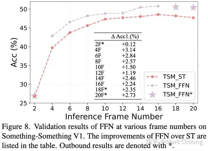 为了验证Inference at Any Frame的策略,我们将FFN在2-20帧的所有偶数帧进行了推理评估,对于4-16帧内部的结果,我们称之为Inbound Results,因为训练所用到的最低帧是4帧,最高帧是16帧;而2/18/20帧的结果则称之为Outbound Results。由图8可知,FFN能够在所有帧的推理结果上全面超越ST,ST需要重复10次训练过程得到10个训练模型,而我们只需训练一次,得到模型的参数量与ST单次训练得到的模型参数量相当。