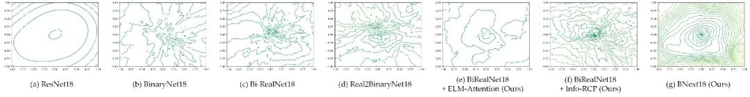 其次,作者提出结合 Element-wise Attention (ELM-Attention) 的增强二值 Basic Block 模块。作者通过堆叠多个 Info-RCP 模块完成 Basic Block 的基础搭建,并对每个 Info-RCP 模块引入额外的 Batch Normalization 和连续的残差连接以进一步缓解不同 Info-RCP 模块间的信息瓶颈问题。基于旁路结构对二值模型优化影响的分析, 作者提出使用 Element-wise 矩阵乘法分支对每个 Basic Block 的首个 3x3 Info-RCP 模块输出进行分布校准。额外的空域注意力加权机制可以帮助 Basic Block 以更灵活的机制进行前向信息融合与分发,改善模型 Loss Landscape 平滑度。如图 2.e 和图 2.f 所示,所提出的模块设计可以显著改善模型 Loss Landscape 平滑度。