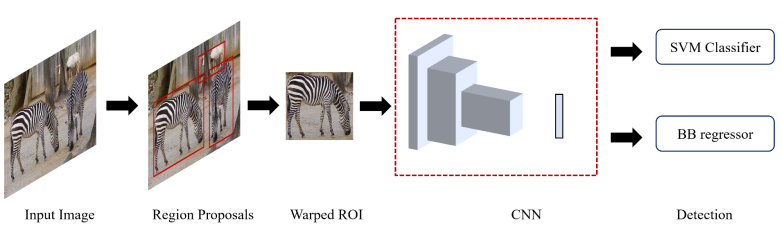 R-CNN 有一个复杂的多阶段训练过程。第一阶段是使用大型分类数据集进行预训练。第二阶段是使用经过特定预处理的图像输入至网络,通过随机初始化的 N+1 分类器(N 是类别数)替换分类层来进行检测微调,其中优化器使用的是随机梯度下降(SGD)。最终,R-CNN为每个类别训练一个单行 SVM 和边界框回归器。