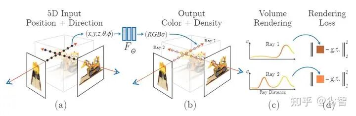 NeRF提出一种隐式的表达方式来对三维场景进行表达, 其利用三维空间中的点 , 将场景建模成volume density 和color 的形式。其网络可抽象为 :