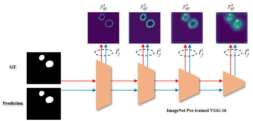 其中,IoU loss 和 BCE loss 在分割任务中被广泛采用并已被验证有效。LossNet 使用一个 ImageNet 预训练分类网络(如VGG-16)提取预测和实际值的多尺度特征,并计算它们之间的特征差异作为损失函数