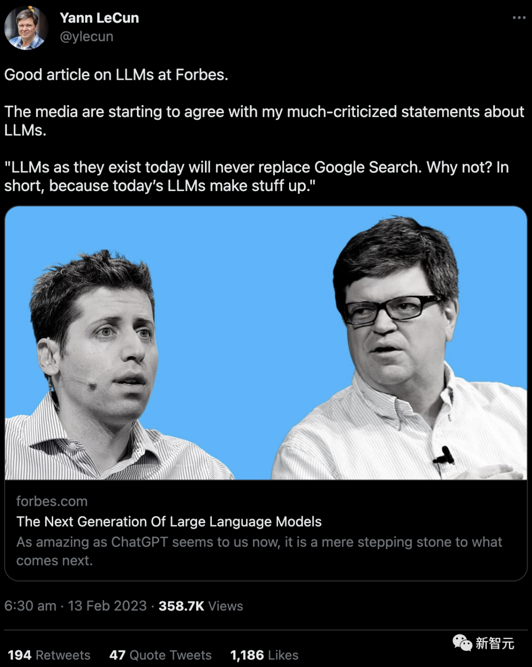 2月7日,LeCun发布了我们开头看到的那条推文,并转发了一篇福布斯的文章,对于自己得到媒体的支持表示开心。
