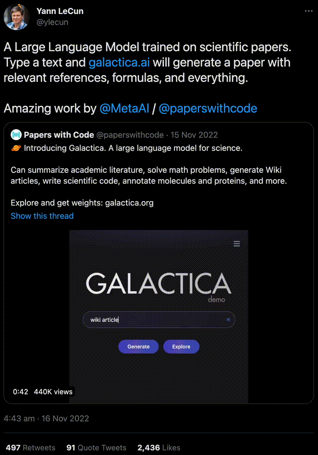 不过,即便是换了阵营的LeCun,也还是不忘为自家的Galactica辩护:它是可以作为科学写作的辅助工具的!