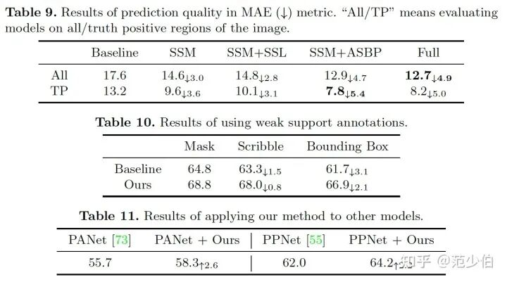 第二个优点是更高置信度的预测结果。分割算法会使用阈值将预测结果中的连续[0,1]值变为0-1值,但是初始的预测结果质量也很重要,尤其是对于困难样本。如果预测值在0.5附近,这个点上的预测就很容易失败。我们希望得到更加鲁棒和高置信度的预测结果。因此,我们使用 MAE 对预测结果的连续[0,1]值进行评估。如图9所示,我们的算法可以得到更低的 MAE,这意味着我们的预测结果具有更高的置信度。表9和表10显示我们的算法对其他形式的 support 标注也很鲁棒。 -