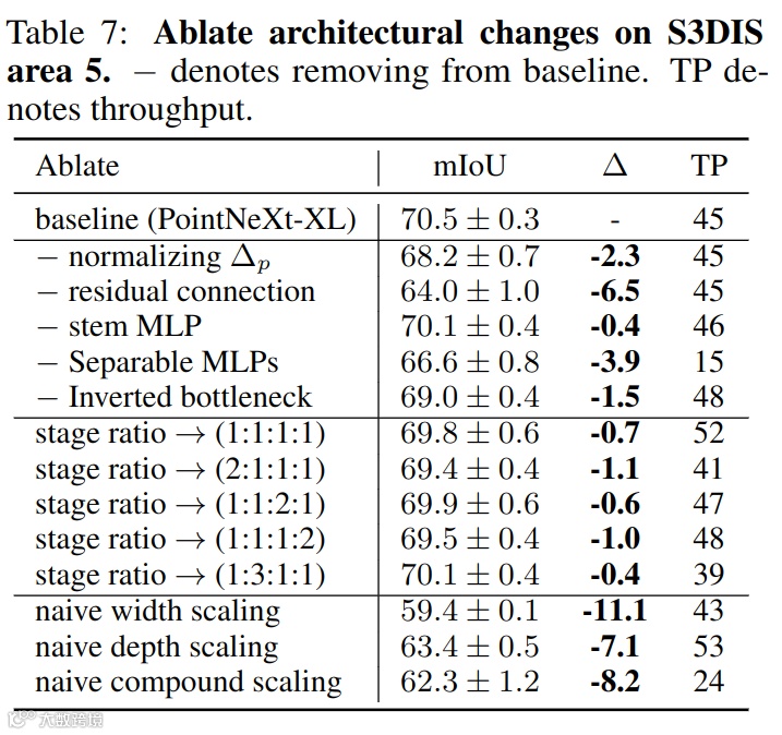 在PointNet++基础上结合InvResMLP 和图一所示的宏观架构变化,我们提出了PointNeXt。我们将 stem MLP 的channel大小表示为 C,将 InvResMLP 模块的数量表示为 B。我们 PointNeXt 系列的配置总结如下: