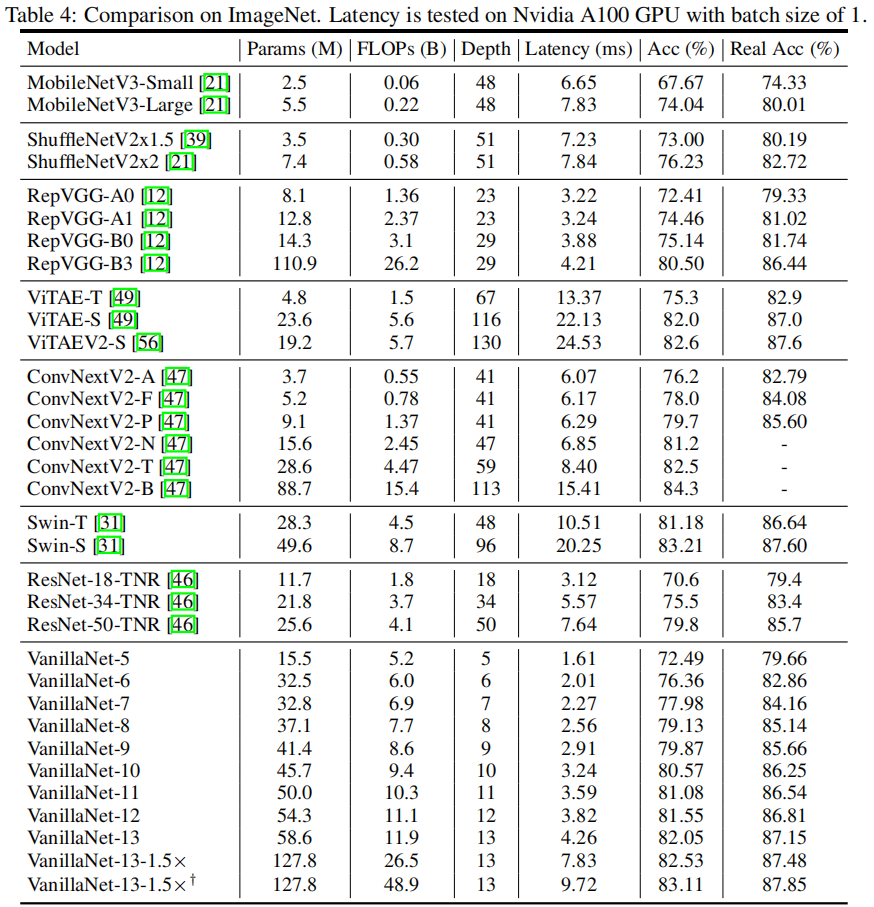 以MobileNetV3-Large为例,尽管其具有非常低的FLOPs,但其GPU延迟为7.83,远高于VanillaNet13。这种配置的推理速度与复杂度和层数强相关; -