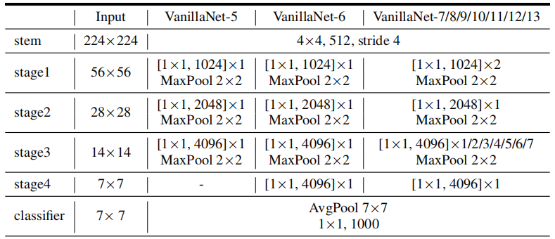 基于上述分析,作者提出了VanillaNet这样简到极致,无任何额外分支,层数更少的架构。如上表所示,