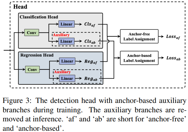 鉴于此,本文提出了锚定辅助训练(AAT),其中引入了基于锚定的辅助分支以结合基于锚定和无锚定范式的优点。它们同时应用于分类和回归头,下图清晰的显示了带有辅助装置的检测头: