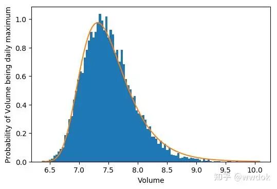 下面我们用一个例子和代码来验证一下这个极值分布的规律。假设你每天都会喝很多次水(比如100次),每次喝水的量服从正态分布N(μ,σ2)(其实也有点不合理,毕竟喝水的多少不能取为负值,不过无伤大雅能理解就好,假设均值为5),那么每天100次喝水里总会有一个最大值,这个最大值服从的分布就是Gumbel分布。