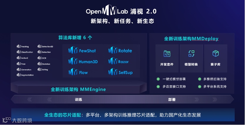 经过一年的潜心研发,OpenMMLab 2.0 正式亮相。我们发布了新一代训练架构 MMEngine,以统一的执行引擎,灵活支持了各算法库中 20 个以上的计算机视觉任务和半监督、自监督等丰富的训练流程。在此基础上,OpenMMLab 2.0 还新增了 MMRotate,MMFewshot,MMFlow,MMHuman3D,MMSelfSup,MMRazor 六个算法库和 MMDeploy 模型部署框架,实现了从模型训练、部署到推理的无缝衔接,打通了 AI 落地的最后一公里。OpenMMLab 2.0 还对训练和推理芯片进行了广泛适配,并在新一代核心架构设计之初就将多训练芯片的支持纳入考量,促进了国产软硬件生态共同发展。