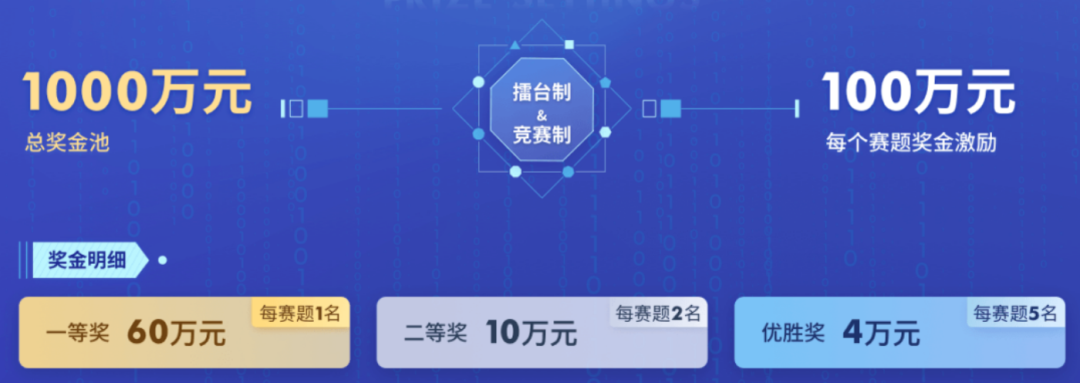 2.大赛支持单位设立重磅奖金,吸引全球人工智能人才及团队,形成一批具有国际竞争力的人工智能创新型产业集群。大赛将设立总奖池1000万,参赛团队可获最高60万奖金激励,或成为史前最高奖金金额的算法大赛。