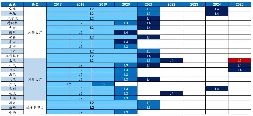 低级别的L2已经量产上市,高级别的L4则在成本、技术和路权等方面仍存在难点,从内资来看,一汽、北汽规划2021年实现L4量产,但更多车厂则在2022年后推出。