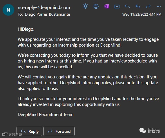 DeepMind:此刻我们决定停止招收新的实习生,此前您约好的面试已经取消。