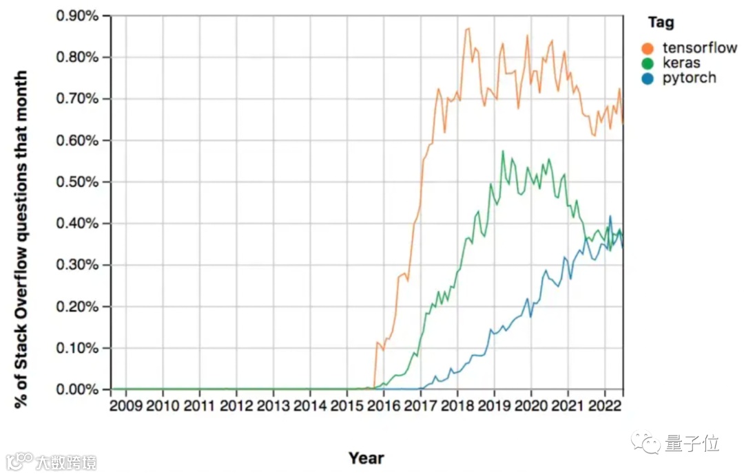 好奇哪种框架目前关注度更高,她便对Stack Overflow上3种主流框架Keras、TensorFlow和PyTorch进行了一个统计: