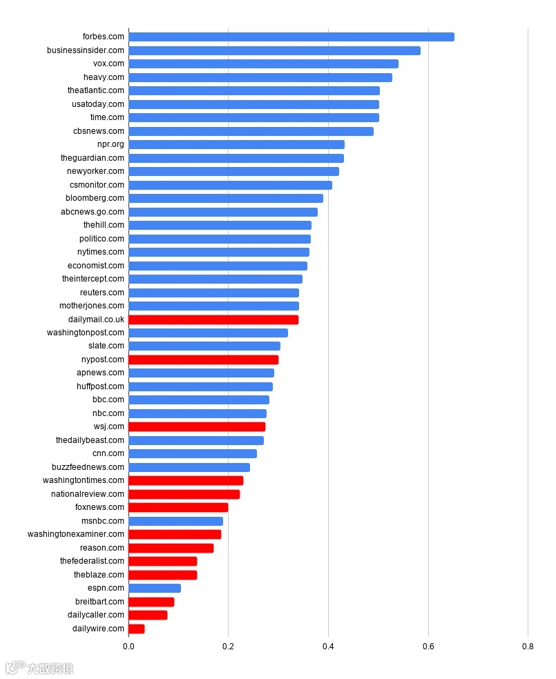 数据显示,在谷歌的网站流量百分比排名中,最低的十个网站(布莱巴特新闻、福克斯新闻、每日来电、火焰、原因、联邦主义者、每日电讯报、华盛顿审查员)中有八个是保守派网站。