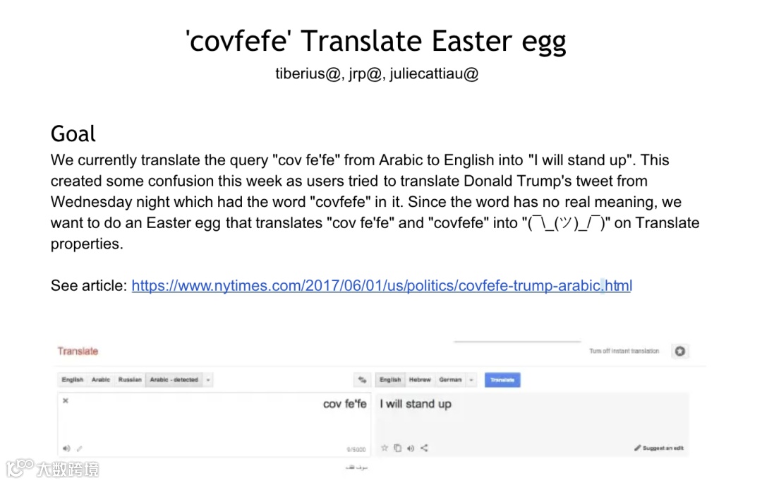 在一份被泄露的名为「covfefe Translate Easter egg」文件中,谷歌的工程师们甚至从阿拉伯语词典中删除了「covfefe」这个词以及它的意思「I will stand up」,并用耸肩表情符号取而代之,以推进他们的反特朗普政治议程。