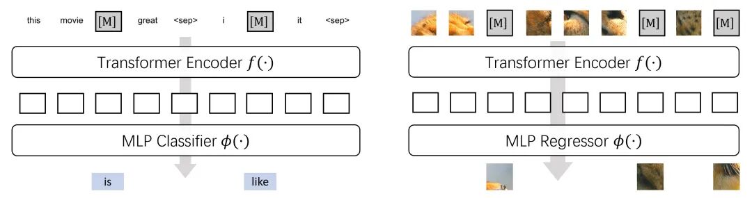 BERT 预训练算法的思想其实是通用的:将输入的一部分信息给随机删除(去掉一句话中的若干个单词,或涂黑图片中的部分像素),并希望神经网络能够还原这些被删除部分(还原单词或像素,类似做完形填空)