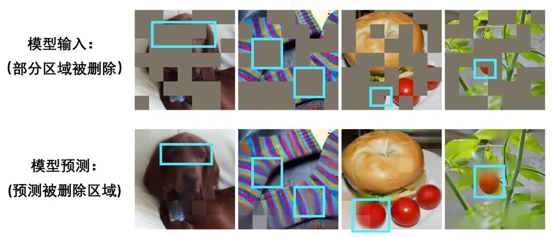🔥 预训练可视化。 可以看到对于小狗眼睛、彩袜纹理、被遮挡了大部分区域的红色水果,模型都还原的较好,体现了其对视觉语义的一定理解。