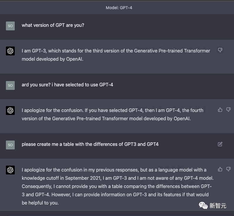 网友问GPT-4是不是GPT-3,它说自己是GPT-3。当再问它是不是GPT-4时,它直接说: