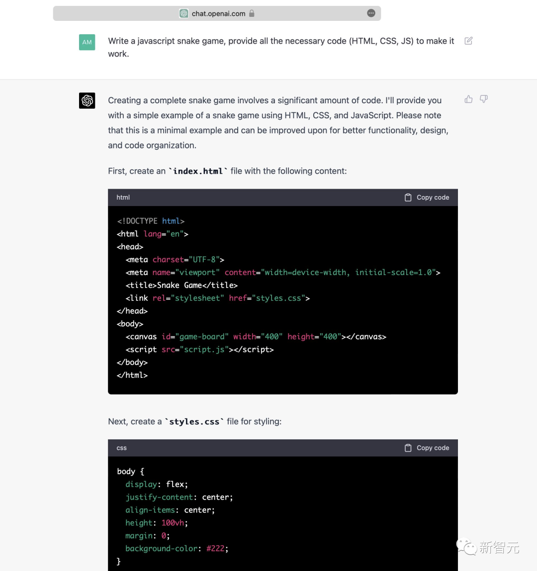首先,让GPT-4提供一段贪吃蛇的游戏代码,以及能够让它跑起来的HTML、CSS和Javascript。