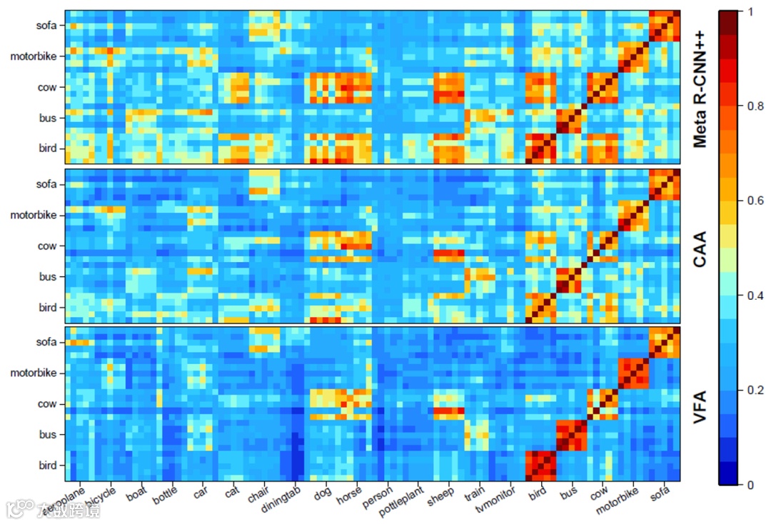 b)不同特征聚合方法可视化分析。 如下图三所示,CAA 可以减小基础类与新颖类之间的混淆;VFA 在 CAA 的基础上,进一步增强了类间的区分度。