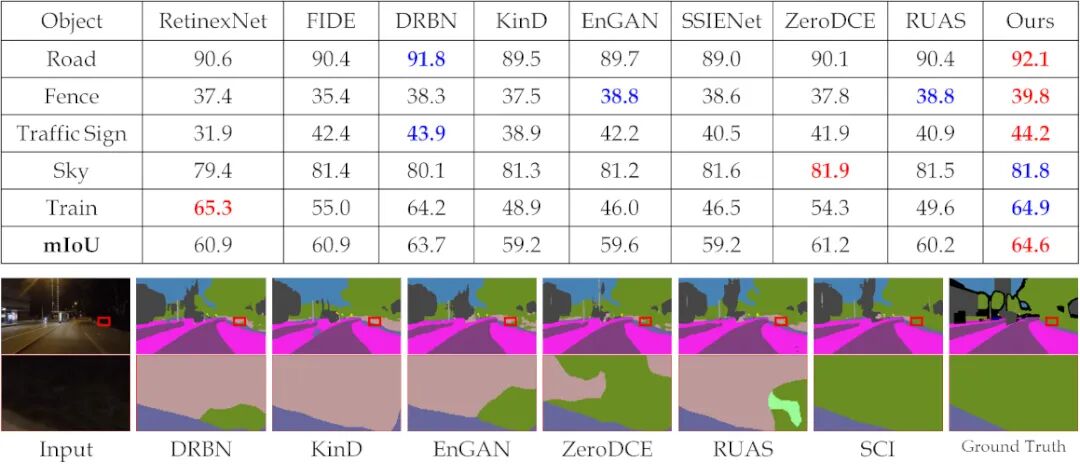 图6展示了夜间语义分割性能,可以看出,SCI获得了有竞争的数值结果,同时在类别划分上更准确,边缘刻画更清晰。