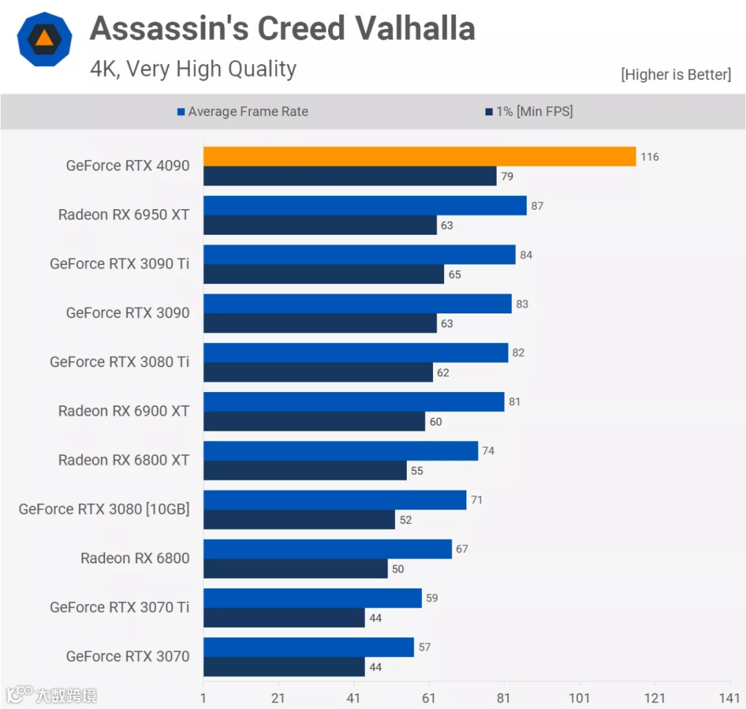 「刺客信条:英灵殿」也是一个在 A 卡上运行良好的游戏。测评结果表明,在 1440p 情况下,RTX 4090 的帧率比 6950 XT 高了 27%,这是一个不错的增益,但远不如其他对比提升,并且 RTX 4090 也仅比 3090 Ti 提高了 37%,而不是 4K 时的 60% 增益。