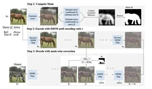 上面这幅流程图清楚地揭示了整个算法的流程。首先我们将原图片加上随机的噪声到达较为接近纯噪声的某个幅度(如五成至六成附近,这个比例是由实验得出的)。接着我们再分别使用描述原图片的原文本和目标文本所去噪的结果的像素差值来得到一个掩码(比如上图里马形的掩码)。之后我们再使用DDIM的确定性加噪方式,将图片加到一定程度后,使用类似前面我们提到过的方式分别处理掩码区域和背景区域。