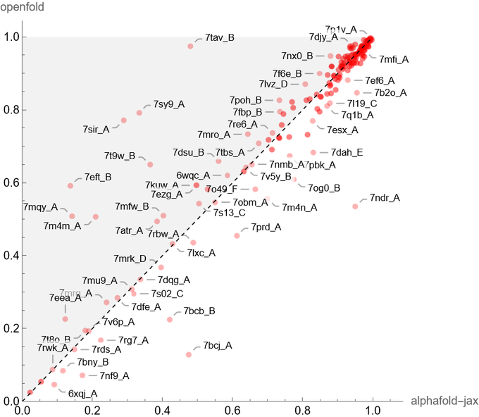 长序列推理:通过该研究实现的低记忆注意力(low-memory attention)对极长链进行推理,OpenFold 可以在单个 A100 上预测 超过 4000 个残基的序列结构,借助 CPU offload 甚至可以预测更长的序列; -