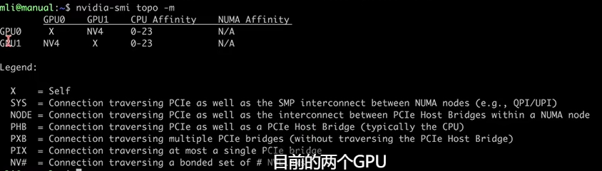 可以看到两个GPU由NV4连接。4表示4个通道,这就代表连接是正常的。