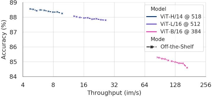 作者在11个 SOTA 的预训练 ViT 模型 (直接下载开源模型,不进行任何额外的训练) 上使用了本文提出的 ToMe 方法。AugReg 实验结果如下图8所示,为在大规模数据集预训练的模型,再在 ImageNet-1K 上 fine-tune 得到的结果。SWAG 实验结果如下图9所示,为在大规模数据集弱监督预训练的模型,再在 ImageNet-1K 上 fine-tune 得到的结果。结果表明,无论模型的尺寸和类型,ToMe 都能够带来约2倍的吞吐量加速。即使减少 96-98% 的 tokens,最大的模型几乎没有任何精度下降:在2倍吞吐量的设置下,AugReg 得到的 ViT-B,ViT-S 和 ViT-Ti 都有大约 4-5% 的精度下降。ViT-L 在 224px 图像上仅下降 2%,在 384px 图像上下降 0.7%,可能是因为更大的输入图片有更多的 tokens。而且,因为大型模型更深,因此允许其中间特征发生更渐进的变化,这也减少了 merging 带来的影响。