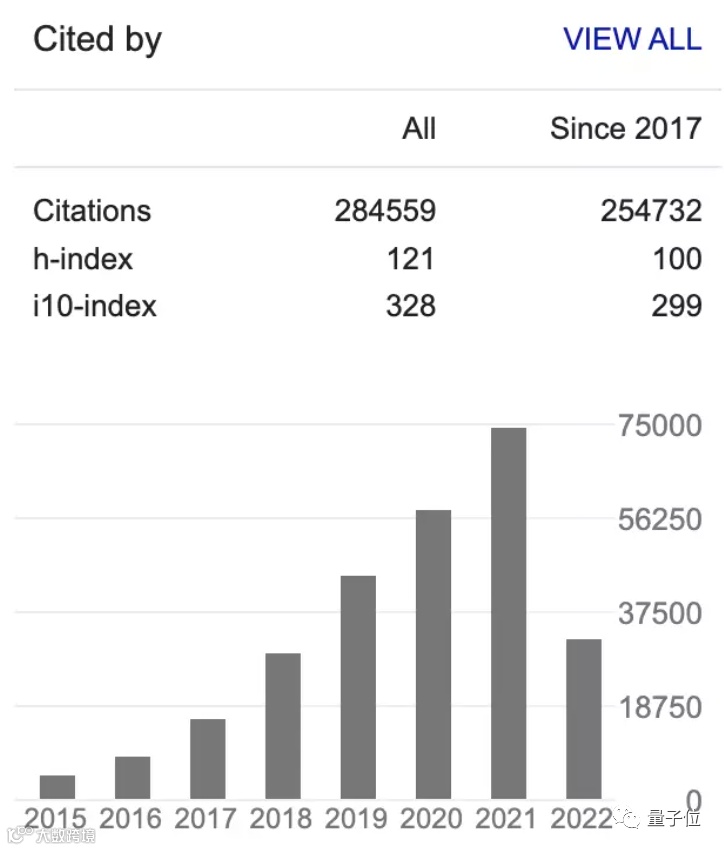 Google Scholar数据显示,孙剑博士论文引用量达到284559次,h-index为121。