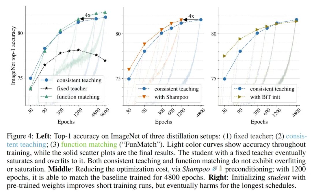 按照与之前相同的协议,在图4(左)中,报告了3种蒸馏设置的学生训练过程中的准确性曲线: