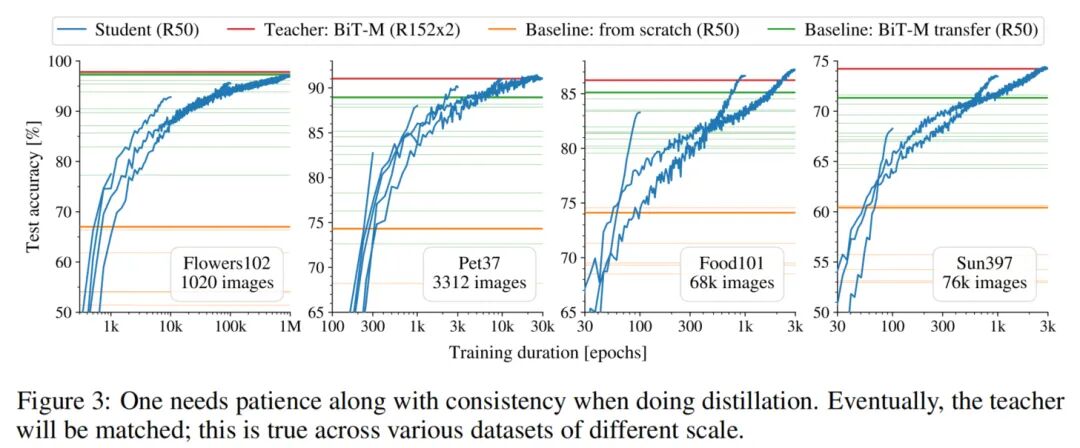 在图3中证实了作者的假设,对于每个数据集,显示了在训练最佳函数匹配学生模型时不同数量的训练Epoch的测试精度的变化。教师模型为一条红线,经过比在标准监督训练中使用的更多的Epoch后,最终总是能够达到。至关重要的是,即使优化了一百万个Epoch,也没有过拟合的迹象。