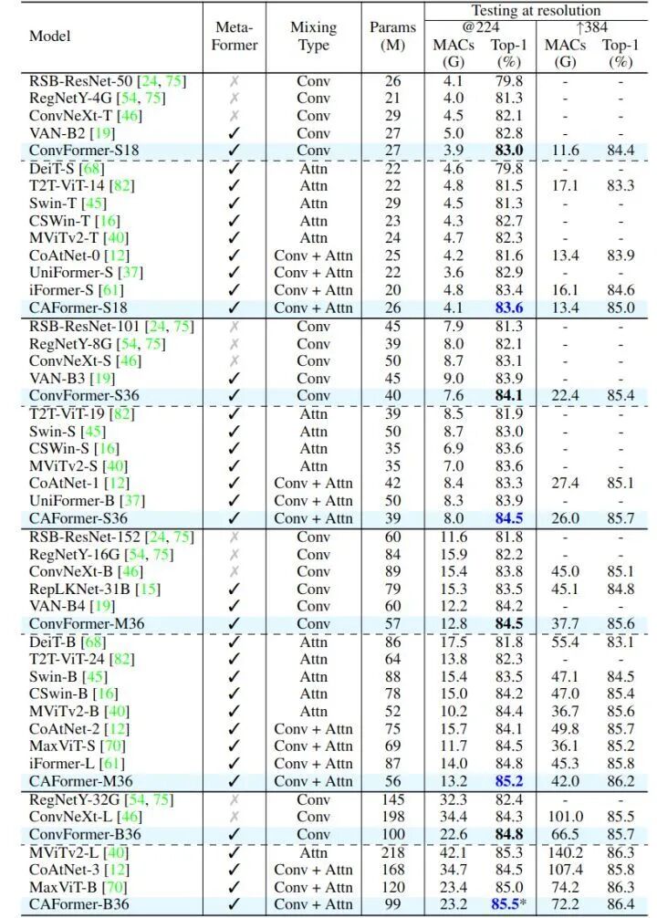 CAFormer 在 ImageNet-1K 上创下了新纪录: 使用了自注意力机制作为令牌混合器之后 (前2个 stage),在 ImageNet-1K 上在224×224 的分辨率下达到了 85.5% 的 top-1 精度的新记录。