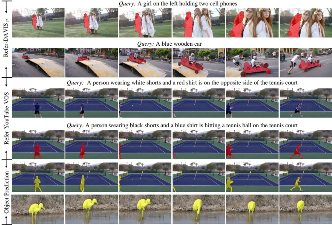 团队亦分享了基于前述解决方案与两个流行的RVOS数据集进行的定量及定性对比实验,即:Refer-DAVIS17和Refer-YouTube-VOS。