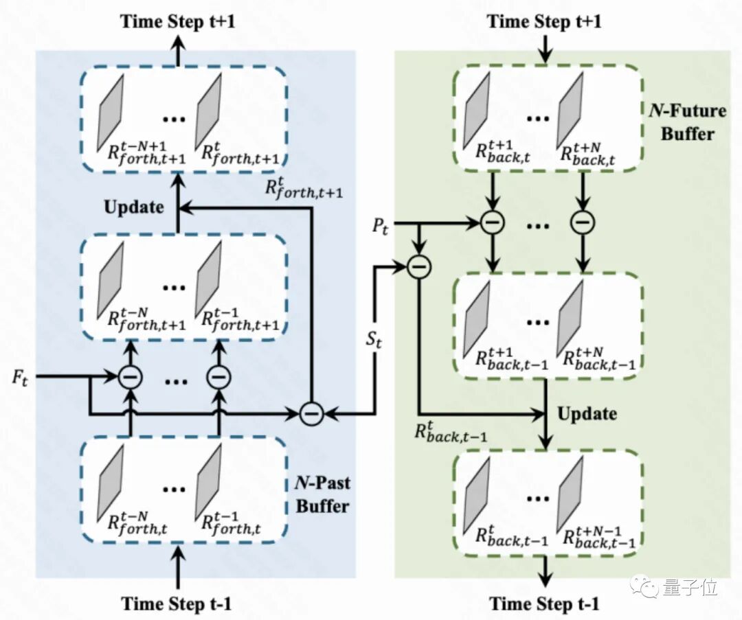 为了充分利用不同时刻下的互补信息, 我们维护了长度为 的存储器, 来存储 个过去 和末来时刻的超分辨率结果,即 和 。
