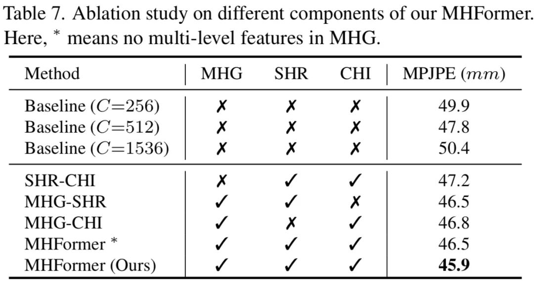作者给出了不同模块对模型的影响。其中Baseline为标准的Transformer结构(ViT)。可以发现所提出的模块均可提升性能。这些结果表明,学习多假设时空表示对于三维人体姿态估计具有重要意义,并且应该以独立(SHR模块)和交互(CHI模块)的方式对不同的假设表示进行建模。