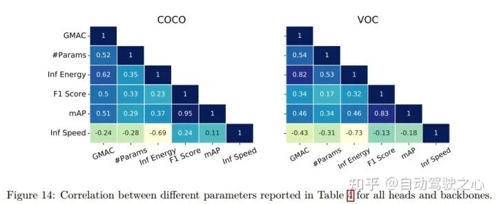 在检测头中,NanoDet实现了高精度和速度,同时还具有较高的计算效率。CenterNet和TTFNet也提供了良好的平衡,而TTFNet有更快的训练时间。DETR(同样,NanoDet)在与较轻的主干配对时显示较低的MAC计数。为了进一步证明在不同指标上评估网络的重要性,正如所见,精度与所有其他指标正相关,GMAC在F1得分之后是最高相关的。速度仅与推理能耗高度负相关。能耗与GMAC的正相关性最高,表明MAC操作较多的网络往往会消耗更多的能量。