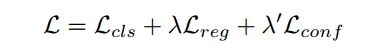 其中Lcls是Focal Loss,Lreg和Lconf都是L2 loss。Lconf是衡量bbox是否为目标的置信度损失(例如,如果一个框其实是背景,则其目标的置信度将降低),λ和λ'是平衡权重。