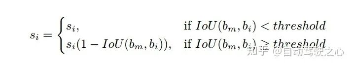 其中,bm是具有最高置信度的proposal,bi表示为真值生成的其它proposal。如果此值大于设置的NMS阈值(通常为0.5),则删除重复项。 然而,与NMS相关的问题之一是,当proposals(针对不同实例)彼此接近或在某些情况下重叠时,有效的proposal会被抑制。对于拥挤场景尤其如此。因此,研究人员提出了Soft-NMS来改进NMS约束。在Soft-NMS中,与bm 重叠稍小的检测proposal(对于其他实例)的置信度分数衰减,同时确保与bm重叠较高的proposal置信度分数衰减更多,从而可以去除重复项,又不至于完全抑制掉。这是通过计算(一个proposal bi)置信度得分和IoU与bm的负值的乘积来完成的: