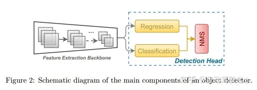 目标检测问题可以形式化为:给定任意图像和预定义的目标类别列表,目标检测模型不仅对图像中存在的目标实例类型进行分类{c1,c2,...,cm},还返回边界框形式的每个目标的位置{b1,b2,...,bm},其中bi={(x1,y1),(x2,y2)}是边界框的左上角和右下角坐标。目标检测器,包括单阶段和两阶段,通常由特征提取器(以下简称主干)和检测头组成。主干通常是基于CNN的网络,它提取场景中最突出的表示(从低级到高级特征)。大多数主干使用池化/卷积层来逐步减小特征图的大小并增加网络的感受野。然后将输出特征图传递给检测头,该检测头执行分类和回归以确定目标实例的标签和位置(下图显示了通用目标检测的组成)。