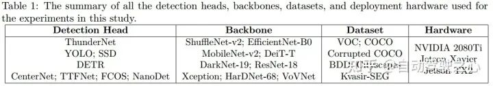 目前人们已经提出了许多实时检测网络,它们实现了SOTA性能,但它们主要关注精度和速度,但省略了其他指标,如简单性、适用性和能源效率等。而这些指标,还包括泛化、鲁棒性和可靠性等网络能力的评估都是很重要的。因此,作者进行了全面的、在不同数据集上、多个检测器上,进行实时目标检测以及目标检测基准的研究,作者还提供了两个关于自动驾驶和医疗保健应用的案例研究。除了精度和推理时间外,作者还评估每个模型的资源和能源消耗,以估计环境影响。作者选择了众多网络并创建了一个统一的框架,可以轻松分析骨干网(或特征提取器)和检测头的不同组合(见下表)。