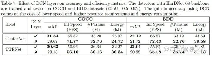引入了可变形卷积(DCN)层,有助于检测具有几何变形的目标。传统的卷积根据定义的内核大小在图像上使用固定的矩形网格。在DCN中,每个网格点都可以移动一个可学习的偏移量,即网格是可变形的。DCN基准测试主要关注精度的提升,而不是其他指标。为了获得有关速度和资源需求的更多信息,作者分析了DCN层对在其最初提出的架构中使用DCN的两个检测器的影响,即CenterNet和TTFNet。下表提供了上述两个检测器的精度、速度、参数数量和能耗并且没有DCN层。在两个数据集COCO和BDD上测试结果。在BDD数据集上,将CenterNet中的DCN层替换为标准卷积层,导致准确率下降1.8%,速度提升8%以上。DCN层的使用也增加了参数量,导致能耗增加13%。在COCO数据集上,将TTFNet中的DCN改为标准卷积层后,精度下降不到5%,而速度提高了10%,能耗提高了约6%。这些结果表明,使用DCN层时存在固有的精度、速度和资源需求权衡。