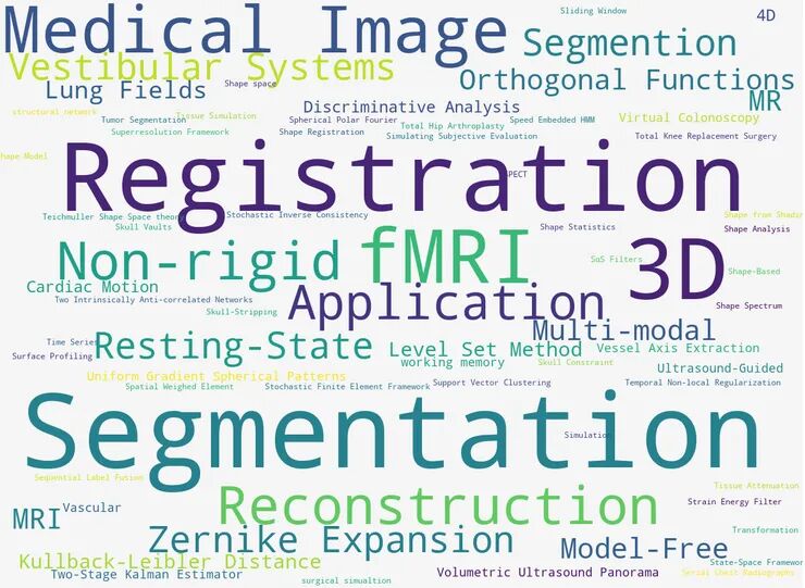 图13—图15分别为对国内单位在MedIA、TMI和MICCAI发表的论文关键词信息进行统计得到的词云图。由图13(a)—图15(a)可见,2012年之前发表在上述三者的论文研究方法多集中于传统的影像分析方法。其中MedIA论文主要包括最小成本路径、统计参数图、随机有限元法和Gabor小波(图13(a)),TMI论文主要包括参数估计、可变形模型、小波变换和模糊聚类(图14(a)),MICCAI论文主要包括水平集、判别分析和基于模板的分析(图15(a))。2012年之前发表在上述三者的论文研究对象多集中在心脏、血管和大脑。此外TMI论文对乳腺和视网膜(图14(a)),MICCAI论文对肺部(图15(a))也有较多研究。2012年之前发表在上述三者的论文研究目标多集中在医学影像的配准和分割。此外MedIA论文对医学影像的标准化(图13(a)),TMI论文对医学影像的重建、分类、融合和聚类(图14(a))也有较多研究。2012年之前发表在上述三者的论文研究影像模态主要为磁共振成像(magnetic resonance imaging,MRI)。此外TMI论文对CT(computed tomography)、超声(ultra-sound)以及多模态磁共振成像,例如功能磁共振成像(functional MRI,fMRI)、弥散张量成像(diffusiontensor imaging,DTI)和磁共振血管成像(magnetic resonancean-giography,MRA)等有较多研究(图14(a))。